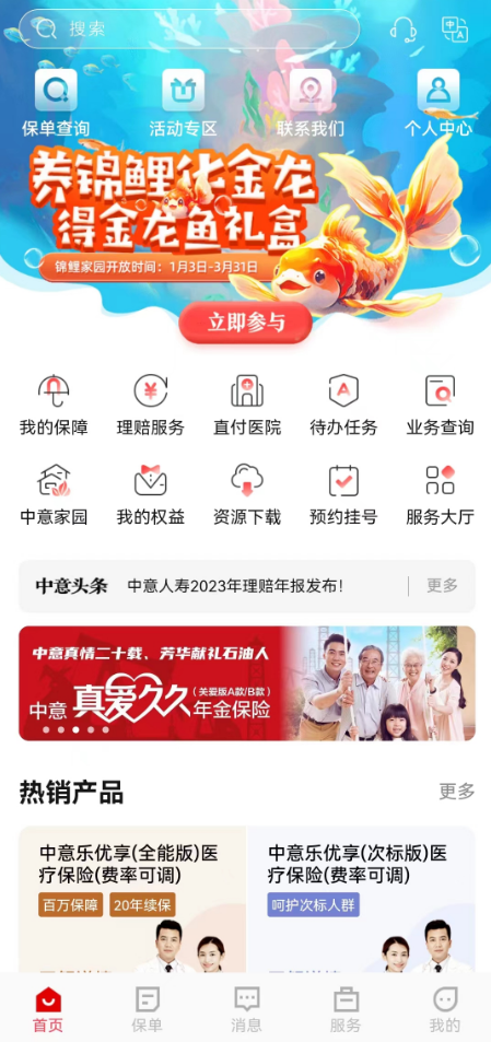 登錄掌上中意,在首頁下方點(diǎn)擊服務(wù)
